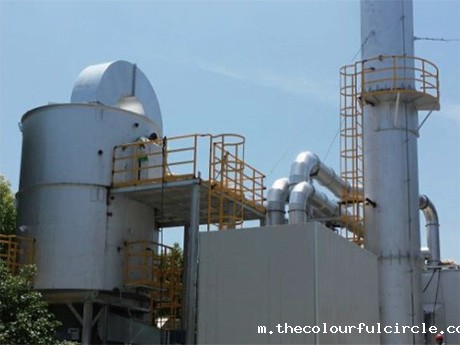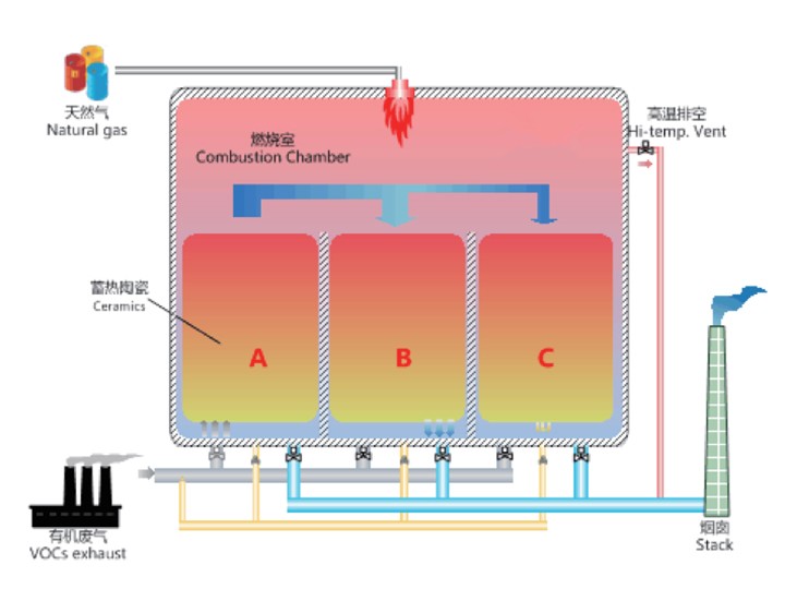 废气由 70℃左右经过蓄热陶瓷换热加热到 300℃左右,进行无焰燃烧反应,温度达到 350℃左右,燃烧后的废气经过另—个蓄热室和蓄热陶瓷换热,降到 110℃左右,有机废气在燃烧室发生氧化反应,生成 C02 和 H20,得到净化,排放至烟囱。