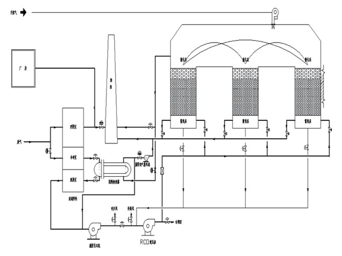 针对低浓度大风量有机废气进行高效浓缩至 10-15 倍,把浓缩后的有机废气加热升温至 760℃,使废气中的 V0C 氧化分解,成为无害的 C02 和 H20;氧化时的高温气体的热量被蓄热体“贮存”起来,用于预热新进入的有机废气,节省升温所需要的燃料消耗。